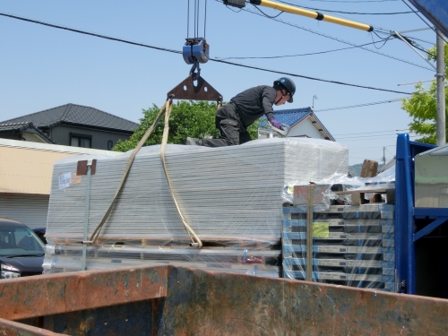 今日は、外壁材のサイディングが現場に納品されています。