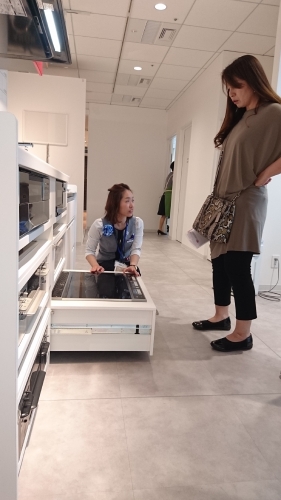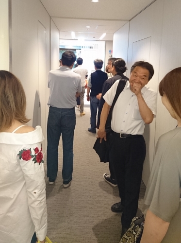 朝、10時からでないと、ショールームが開いていないので、少し前に着いても時間を潰すところがなく・・・。1階のエレベーターホールでお客様と雑談![]()