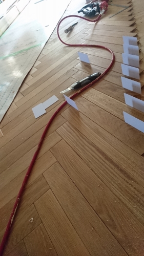 ヘリンボーンの床は、職人さんが一枚一枚板を張る手間をかけて進めていく「寄木張り」です。もちろん、ここでも一枚一枚丁寧に張り進めてました。