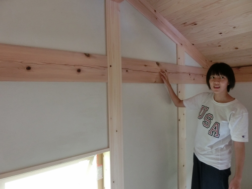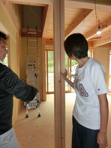 ここでも、棟梁から柱の背割れについてレクチャーを受けています(笑)。ちゃんと理解できてるかな~・・・。