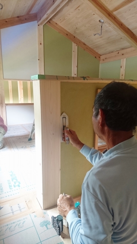 ロフトの壁を塗ってました。緑色の部分が塗ってあり、現在乾燥中の壁。乾くと、色が変わってきます。
