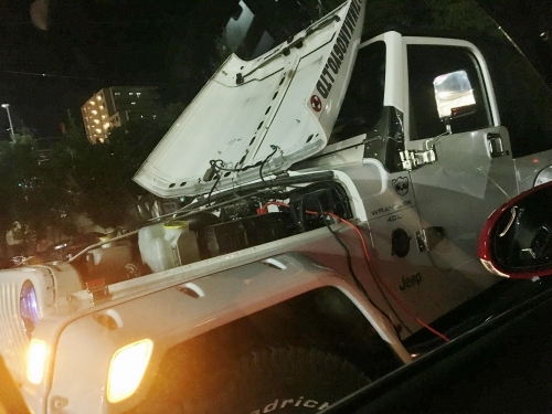 私の車より、はるかに大きなバッテリーを積んでいるはずの、このジープ。娘は、隣の席で、初めて見る光景に興奮![]()