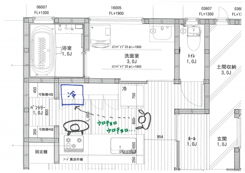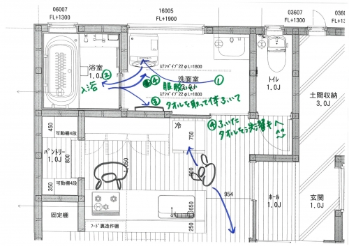 洗濯機の位置、洗面化粧台の位置も、毎日の生活動線を思い出してもらうようにすると、自然に、どこに置いてあるのがストレスが感じにくいのか?という事がイメージしやすくなります。